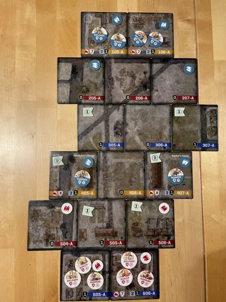 Uusi setup on nopeasti tehty: korttien sekoitus ja rintamamerkit alkuasetelmaan. Aloituskortti tuo Saksaa, Puolaa ja Etelää lähemmäs, mutta onneksi Puola ei ole vielä aktivoitunut. Opin virheistäni ja yritän heti puskea Saksan takaisin. Kolme nopanheittoa, kolme epäonnistumista. Seuraava kortti tuo Suomen ja Saksan uhan taas esiin. Onneksi Suomi pysyy vielä passiivisena, mutta Saksa kärkkyy jälleen Petrogradia ja etelän rintamakin on vain kahden askeleen päässä Moskovasta.