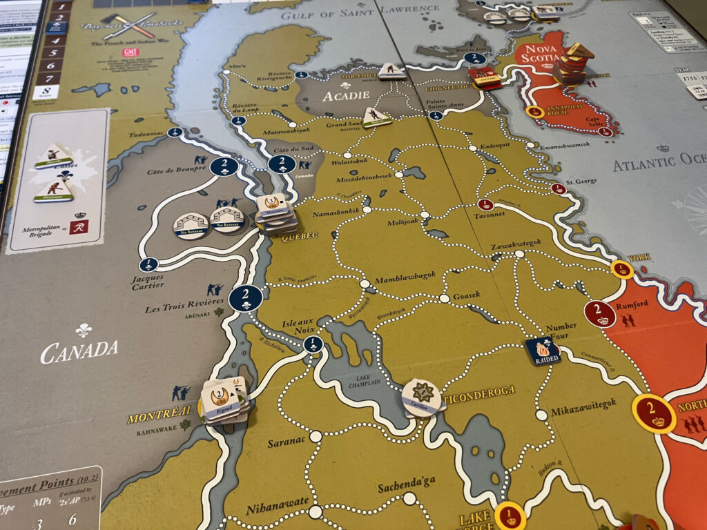 Sunnuntai alkoi Timon kanssa pelatulla Bayonets & Tomahawksilla (2021). Marc Rodriguesin suunnittelema & kuvittama ja GMT Gamesin julkaisema sotapeli kuvaa suurta siirtomaasotaa vuosina 1755-1760. Englanniksi sota tunnetaan nimellä French and Indian War, ja siinä Ranska ja Iso-Britannia taistelevat Pohjois-Amerikan hallinnasta. Pelin nimen mukaisesti intiaanit esittivät sodassa merkittävää roolia, liittoutuen pääosin ranskalaisten kanssa. Sota on Euroopassa tuntemattomampi, mutta merkittävä USA:ssa, eikä vähiten siksi, että sodassa kunnostautui muuan George Washington. Historiallisesti Iso-Britannia voitti sodan ja sen seurauksena esim. Kanadan alueet siirtyivät osaksi imperiumia. Sodasta on julkaistu monia pelejä, joista yksi tunnetuimmista on niin ikään GMT Gamesin julkaisema ja Volko Ruhnken suunnittelema Wilderness War (2001).