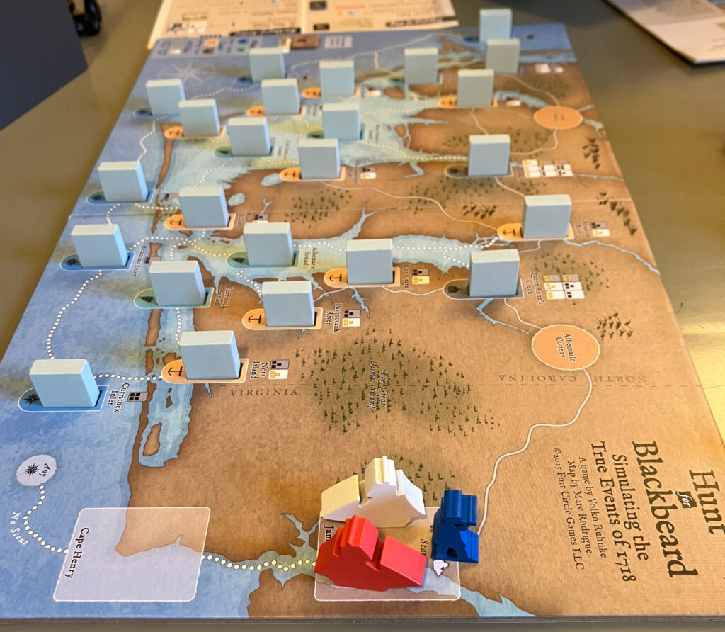 Tämän jälkeen vuorossa oli Volko Ruhnken suunnittelema ja Fort Circle Gamesin julkaisema Hunt for Blackbeard (2026). Pelin oli tuonut paikalla ja sääntöjä selitti itse Mr Fort Circle, Kevin Bertham. Pelissä toinen pelaaja ohjastaa kuuluisaa merirosvoa, Mustapartaa (Blackbear), ja toinen häntä etsiviä viranomaisia. Pelissä on innovatiivinen, pystyssä pidettäviin puupalikoihin perustuva piiloinformaatiomekaniikka, jossa Mustaparta merkitsee liikkeensä puupalikoilla ja etsivät voivat havaita näitä jälkiä omalla vuorollaan, mutta niin, että Mustaparta ei tiedä, onko hänen jäljille päästy. Peli on todella nopea, vain neljä nopeahkoa kierrosta, jonka pelaa noin puoleen tuntiin. Pelasimme kaksi peliä, joista minun ohjastamat etsijät voittivat molemmat. Peli on julkaistu tänä vuonna ja sitä voi myös pelata digitaalisesti Rally the Troopsissa.