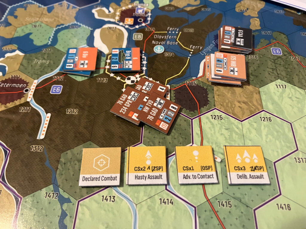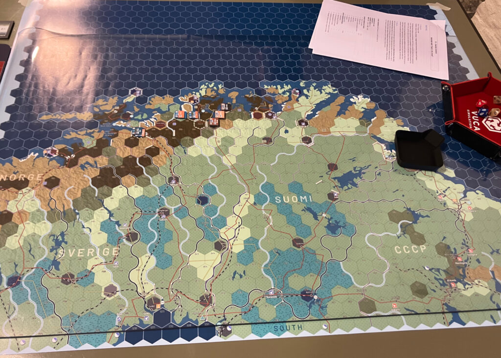 Lauantaiksi olin sopinut vain yhden pelin, tai tarkemmin demotuksen: Northern Strike. Northern Strike on luxemburgilaisen Yves Rettelin suunnittelema ja saksalaisen VUCA Simulationsin aikanaan julkaisema peli kuvitteellisesta kolmannesta maailmansodasta vuonna 1989. ”Cold War Goes Hot”, eli (onneksi) kuvitteelliseksi jäänyttä kolmatta maailmansotaa kuvaavia pelejä on julkaistu viime vuosina useita ja yksi teeman isoja nimiä on vuonna 2023 julkaistu, maailmansodan alkua keski-Euroopassa kuvaava Red Strike. Julkaisuvuonnaan Red Strike voitti kolme Charles S. Roberts palkintoa.